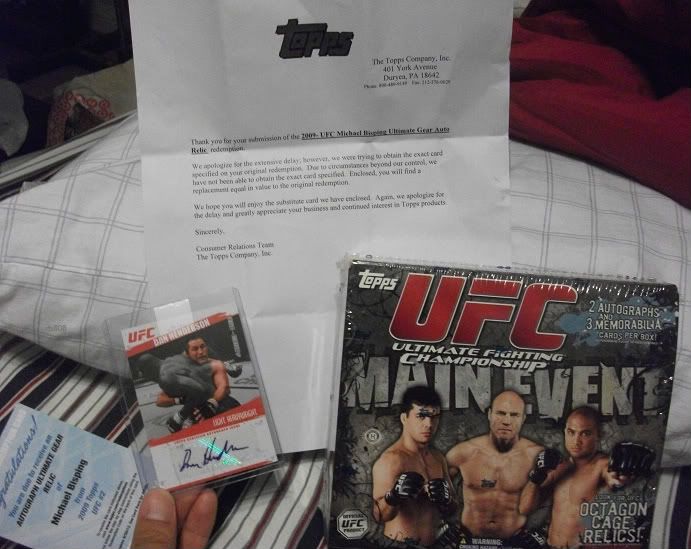 So if you saw my thread a couple weeks ago i bought my first box of rd 2 and pulled a michael bisping Ultimate Gear auto relic redemption card.. I knew i wasnt gonna get it since he didnt sign his autos, but was more than curious to see what they were gonna send me as a replacement.. (Cool, im not a bisping fan anyway) They sent it pretty fast, UPS delivered a box today.. I'm pretty damn happy with what they sent me!