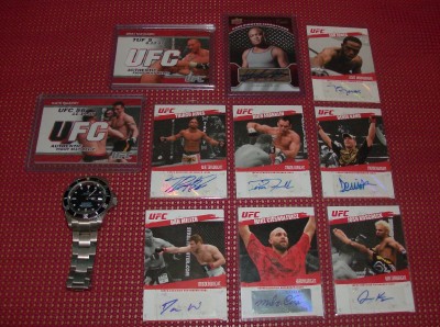 THERE IS TEN(10)CARDS WITH EIGHT AUTOS AND TWO MAT CARDS ALONG WITH A ROLEX WATCH THAT I AM SELLING AS A REPLICA IN THIS AUCTION.THE WINNER GETS IT ALL INCLUDING THE WATCH.LET ME SAY THIS ABOUT THE WATCH.I HAD A JEWELRY SHOP OWNER OF 30 YEARS INSPECT IT AND HE SAID HE COULD NOT SAID YES OR NO ABOUT BEING AUTHENTIC.IT IS THAT GOOD OF A WATCH.HE DID TELL ME IF IT IS A REPLICA IT WOULD STILL SELL FOR $500.00 AND IS IN GREAT CONDITION.THIS IS JUST AN ADDED BONUS TO THE WINNER.THE WATCH IS THE SUBMARINER AND WILL SELL FOR $5000.00 IF AUTHENTIC.THE WINNER GETS IT EITHER WAY.HERE IS THE AUTOS INCLUDED.THE FIRST ONE IS THE 2009 TOPPS JON JONES ROOKIE BLUE AUTO THAT SELLS ON EBAY FOR $100.00 BY ITSELF.NEXT IS A 2009 UPPER DECK PROMINENT CUT ANDERSON SILVA AUTOGRAPHED CARD BV$125.00 - 2009 TOPPS RICH FRANKLIN BLUE AUTO - 2009 TOPPS THIAGO ALVES BLUE AUTO - 2009 TOPPS JOSH KOSHCHECK BLUE AUTOGRAPHED CARD - 2009 TOPPS DAN MILLER BLUE AUTO - 2009 TOPPS JON FITCH BLUE AUTOGRAPHED CARD - 2009 TOPPS DENNIS KANG AUTO - 2009 TOPPS MIKE CIESNOLEVICZ AUTO AND THE SHIPPING WILL BE FREE ON THIS GREAT LOT.A SUPER COLLECTION FOR SOMEBODY!!